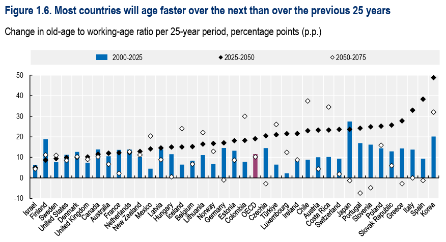OECD genelinde yaşlanma artık ileri bir safhada. 65 yaş ve üzeri nüfusun, 20–64 yaş grubuna oranı: