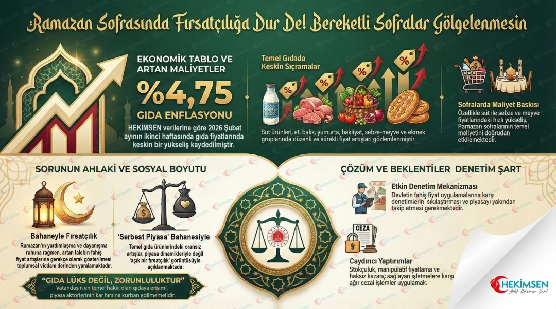 Hekimsen Açlık ve Yoksulluk Sınırı hesaplamasında 2026 yılı Şubat ayının ikinci haftasında gıda enflasyonu %4,75 çıkmıştır. Açıklanan veriler ve harcama kalemlerine yansıyan tablo, Ramazan ayı öncesinde ve Ramazan’ın başlangıcında temel gıda ürünlerinde dikkat çekici fiyat yükselişleri yaşandığını açıkça göstermektedir.